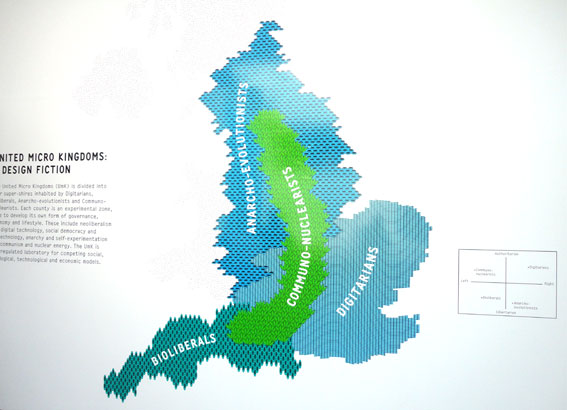 United Micro Kingdoms is the fascinating exhibition at the Design Museum by designers and educators Dunne & Raby. ” The exhibition sees England devolved into four self-contained counties, each free to experiment with governance, economy and lifestyle. These ‘live laboratories’ interrogate the cultural and ethical impact of existing and new technologies and how they alter the way we live.”